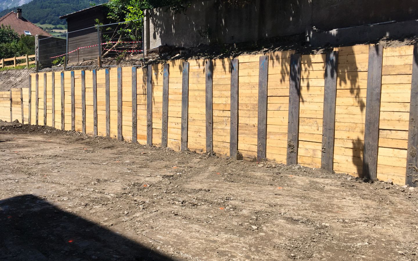 - Puis, nous réalisons la mise en place, à l’avancement des terrassements en descendant par plots ou non, du blindage ou parement et des ancrages/butons avec liernes de liaisonnement et de répartition.